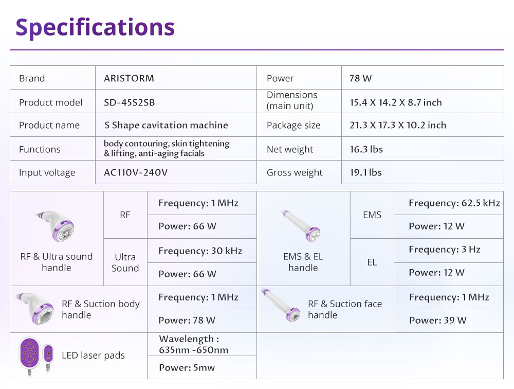 | Cavitation 2.5 &RF Body Handle | Cavitation Frequency:30KHz Power:50W RF Frequency:5MHz Power:85W |